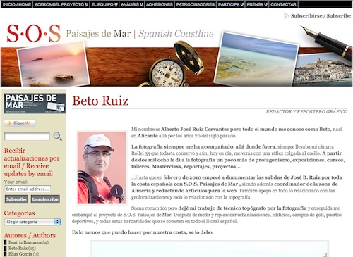 Enero 2010, dejo la topografía y me uno a José B. Ruiz en su cruzada para recorrer toda la costa española para S.O.S Paisajes de Mar y así poner la fotografía como herramienta de protección de nuestras costas. Recorremos toda España incluidas islas, fotografiando los lugares más bellos. http://blog.paisajesdemar.com/contributorscolaboradores/beto-ruiz/